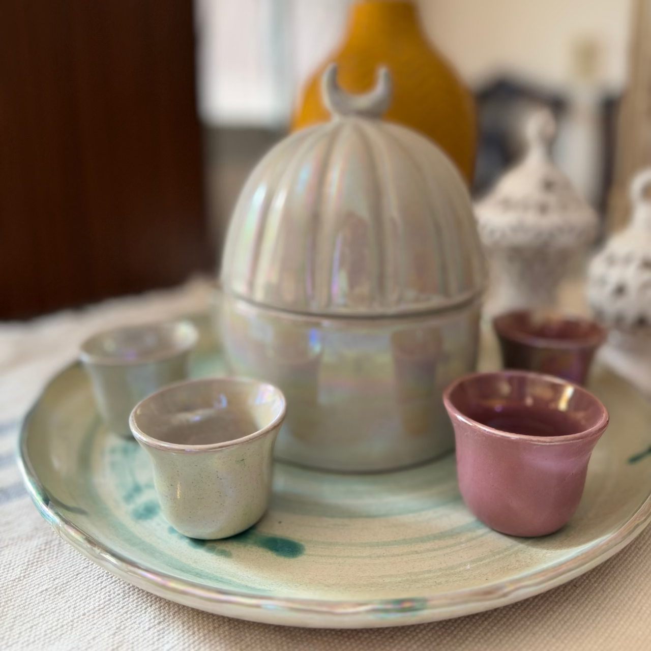 handcrafted pottery dates bowl with a 16 cm diameter, designed to preserve the freshness of your dates while adding an elegant touch to your table. Featuring a carefully fitted lid, this piece blends functionality with artistry, making it perfect for gatherings and special occasions.
